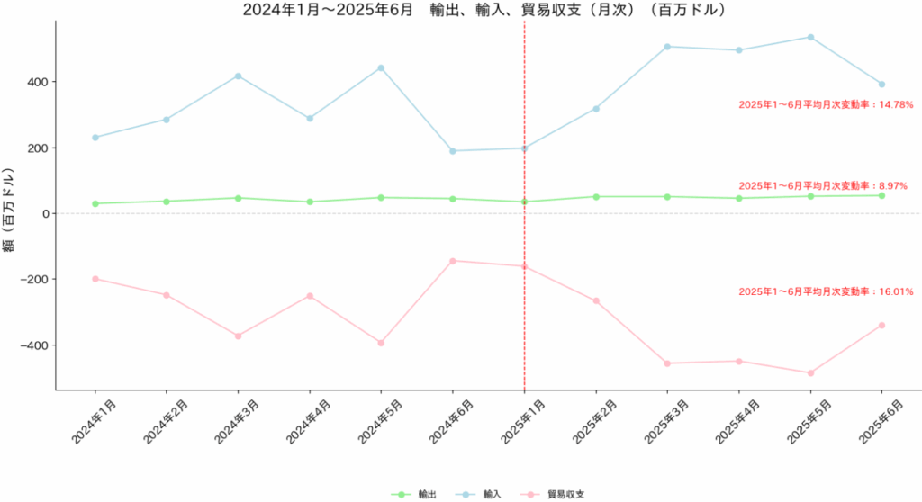 月次でみてみると、2025年前期(1月~6月)では、アメリカからロシアへの輸出で平均9.0%増、輸入は平均14.8%増と、輸出入とも増加しており、貿易赤字は平均で16.0%と、大幅に増加している。