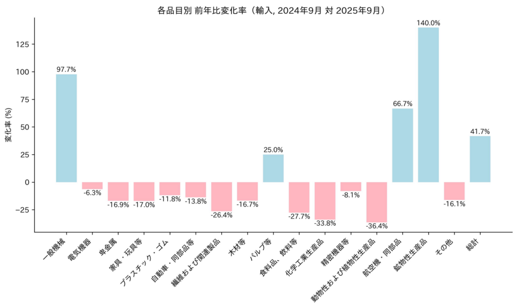 2024年通年のアメリカの台湾への輸出額は425億ドル、輸入は1,153億ドル、貿易収支は727億ドルの赤字。2025年9月単月では、輸出額が45億ドル(対前月比0.9%減)、輸入が148億ドル(対前月比14.9%減)、貿易収支が103億ドルの赤字(対前月比19.9%赤字減)となっている。アメリカの台湾からの輸入において、9月単月では、2024年9月と比較して、総計では41.7%増加。一番増加率が大きいのは、鉱物性生産品の140.0%増、次いで、一般機械の97.7%増。一番減少したのは、動物性・植物性生産品の36.4%減、そして、化学工業生産品の33.8%減と続く。