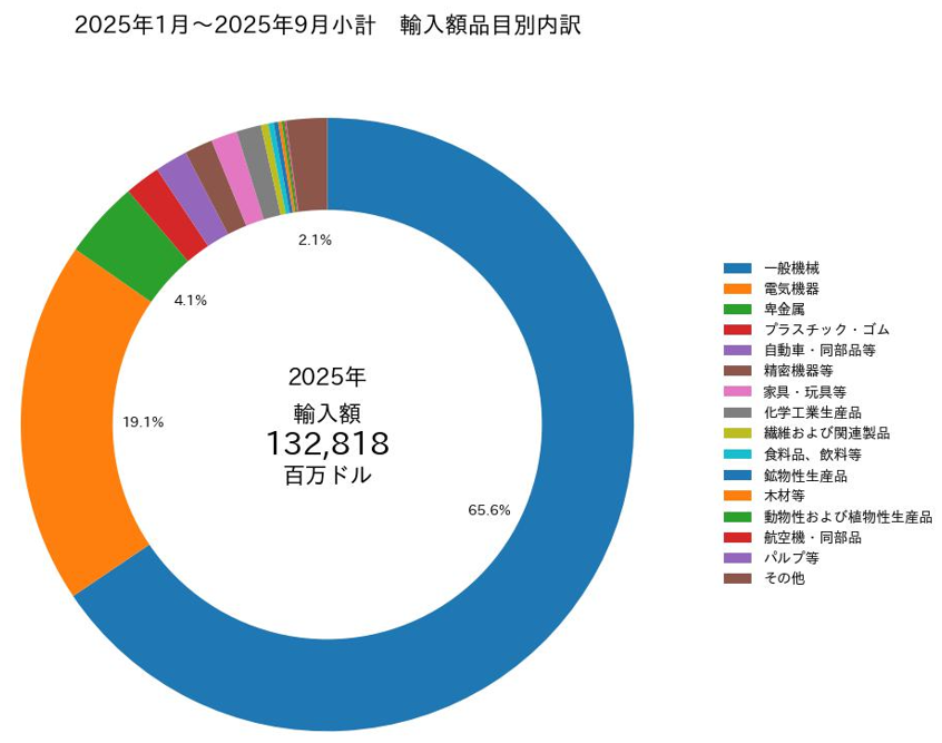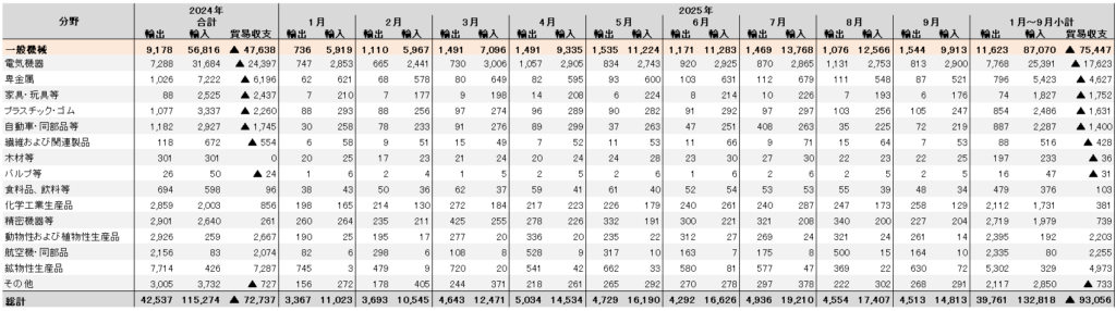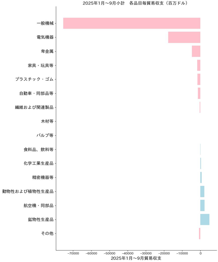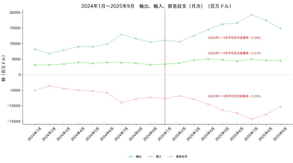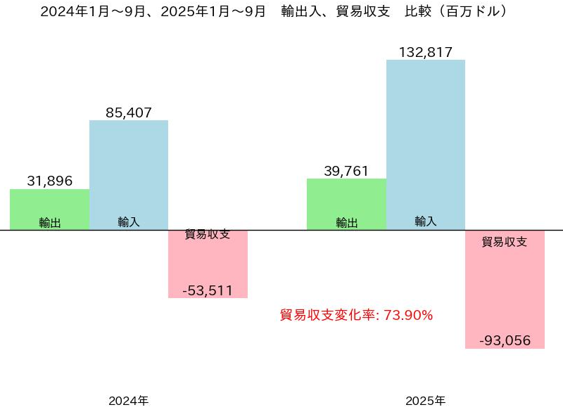 2025年1月~9月小計では、輸出額が398億ドル、輸入額が1,328億ドル、貿易収支が931億ドルの赤字で、赤字額は昨年同時期比で385億ドル(73.9%)増加している。