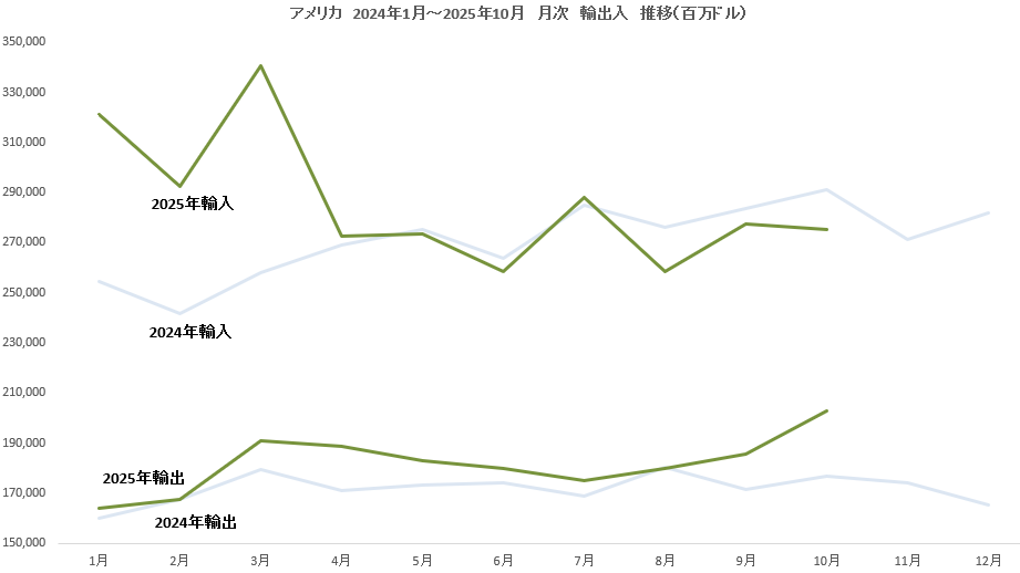 アメリカ 2024年1月~2025年10月 輸出入の状況(百万ドル)