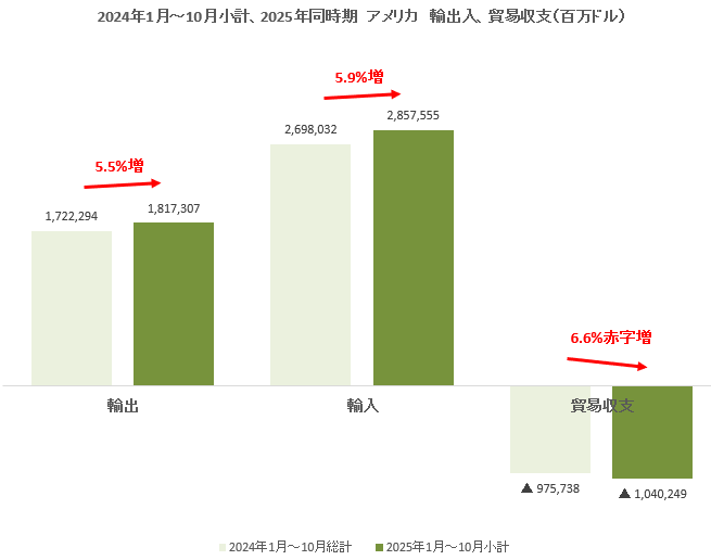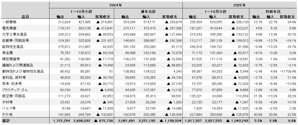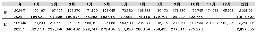 1月~10月小計を2024年、2025年で比較してみると、輸出では5.5%増加、輸入では5.9%増加。貿易収支では6.6%赤字が増加している。