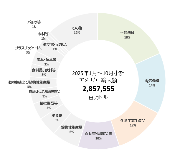 2025年1月~10月小計を品目別でみると、一般機械が18%でトップ、次いで、電気機器の14%、そして、化学工業生産品の12%、自動車・部品の10%と続く。