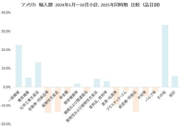 1月~10月小計を2024年、2025年品目別で比較してみると、一般機械が22.7%増加、化学工業生産品も13.3%と増加している。一方、自動車・部品はマイナス13.7%、鉱物性生産品も13.2%減少している。