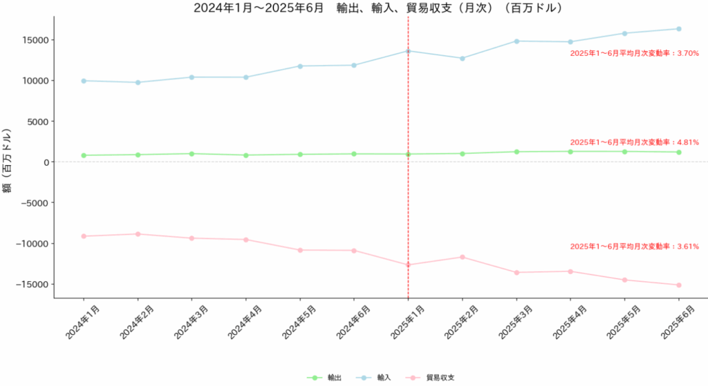 月次でみてみると、2025年1月~6月では、アメリカからベトナムへの輸出で平均4.8%増、輸入は平均3.7%増と、輸出入とも増加しており、貿易赤字は平均で3.6%と、減少している国が多い中、増加傾向となっており、これらは中国からのシフトと思われる。