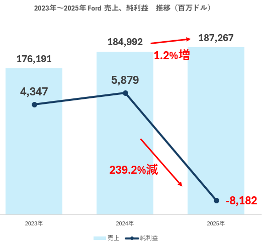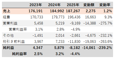 - 2025年の純利益はマイナス82億ドル(利益率マイナス4.4%)と、2024年の59億ドル黒字(利益率3.2%)から、239.2%減少して、大幅赤字に転落