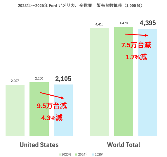 2023年~2025年 Ford 全世界、アメリカ市場での販売台数推移(1,000台)