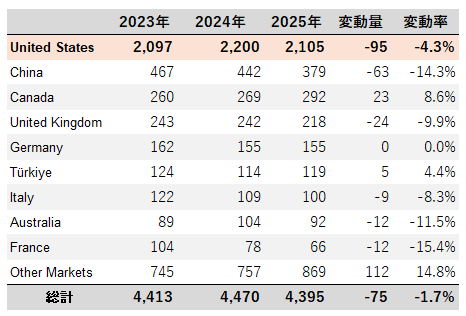 - アメリカ市場での2025年の販売台数は210.5万台で、2024年の220.0万台から9.5万台(4.3%)減少