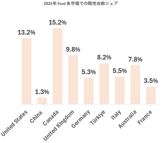 2025年 Ford 全世界、アメリカ市場での販売台数市場シェア(百万台)