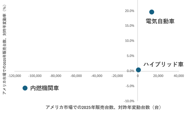 横軸に、アメリカ市場での2025年販売台数、対昨年変動台数(台)025年販売台数、対昨年変動台数(台)、縦軸に、アメリカ市場での2025年販売台数、対昨年変動率(%)をとった散布図でみると、