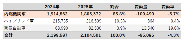 - 一方、電気自動車は、販売台数は少ないが、変動率は対2024年比で19.6%と大幅に増加