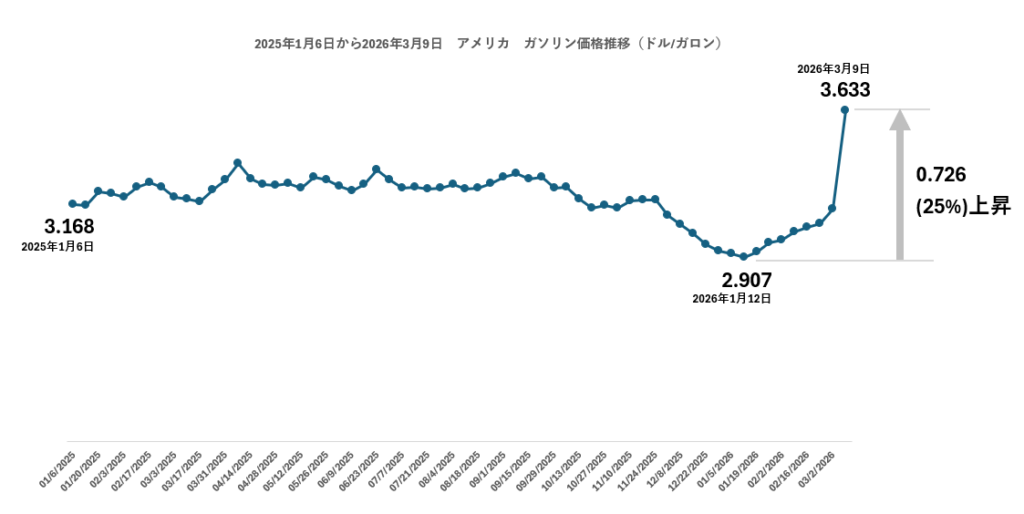• 2026年3月9日の全米平均ガソリン価格は3.63ドル/ガロンで、1週間前の3月2日の3.15ドル/ガロンから15%上昇