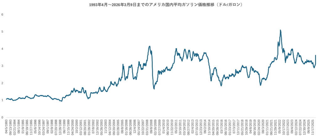 過去33年(1993年4月~2026年3月)の週毎のガソリン価格(ドル/ガロン)推移