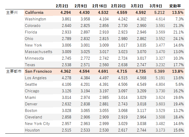 • カリフォルニア州では2026年3月9日時点で、5.21ドル/ガロンと、前週比で14%上昇