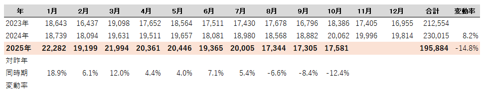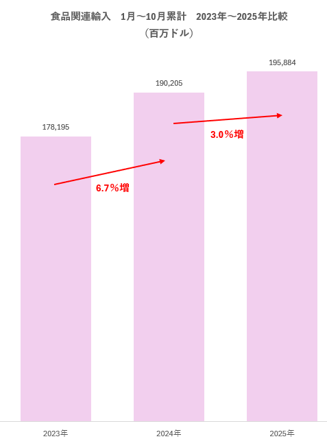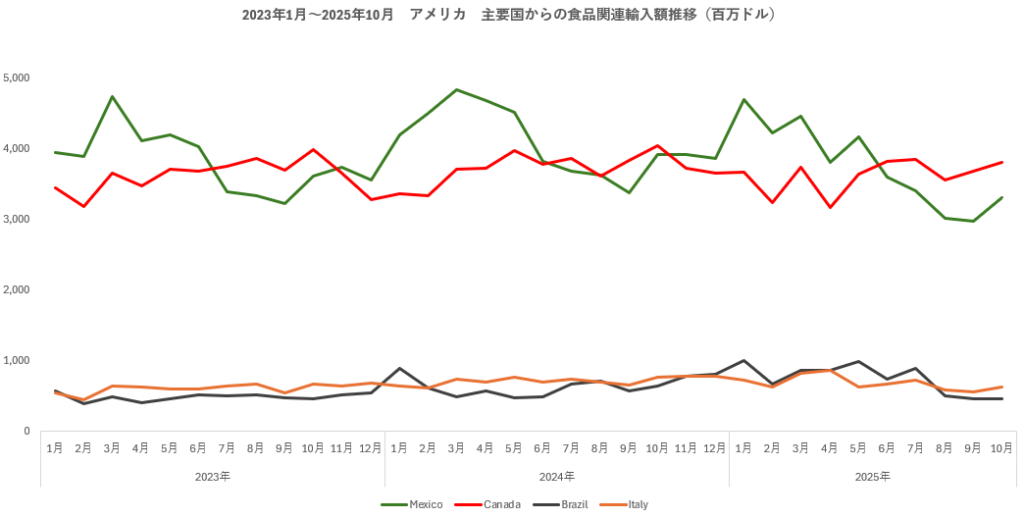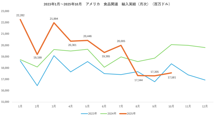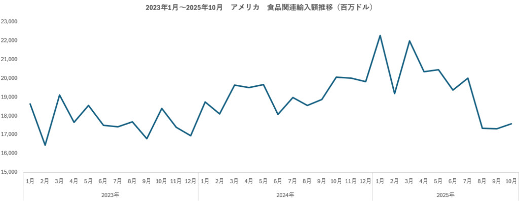 アメリカの2025年1月~10月末まで(公表されているデータは10月までのため)の食品関連(包括的にHSコード01~24)の輸入額累計は1,959億ドルで、2024年同時期の1,902億ドルから3.0%増加している。月単位でみると、2025年1月~6月は2023年、2024年同時期を上回っていたが、8月に大きく減少後、横ばい状態が続いている。