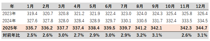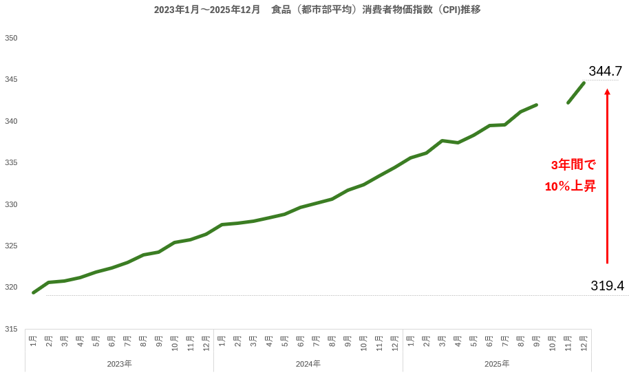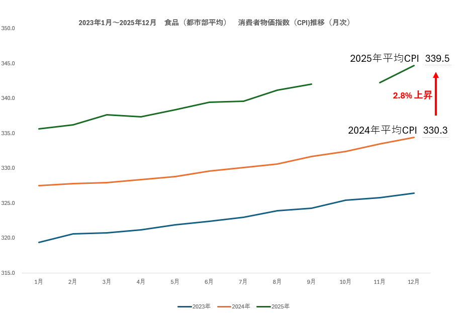 2023年~2025年 食品(都市部平均)消費者物価指数(CPI)推移(月次)