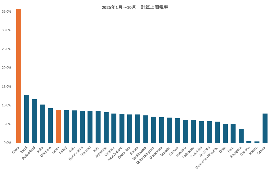 計算上の関税額を輸入額で割った関税率推定では、2025年1月~10月累計で5.6%。国別では、中国が35.8%と特筆して高く、次いで、ブラジルの12.9%、スイスの11.7%と続く。日本は8.9%