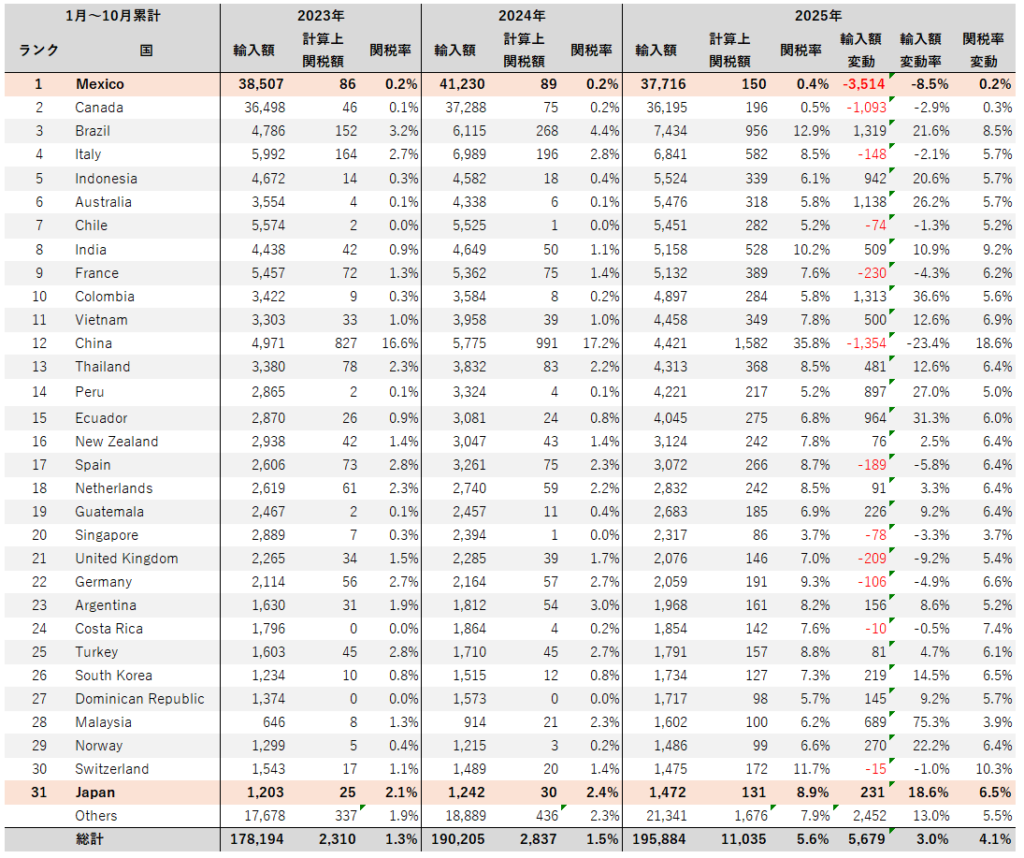 2025年1月~10月累計入額を国別にみると、メキシコからが377億ドル(19%)でトップ、次に、カナダからの362億ドル(18%)、そして、ブラジルからの7億ドル(4%)と続く。日本からの輸入は15億ドル(0.8%)にすぎない。