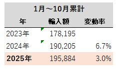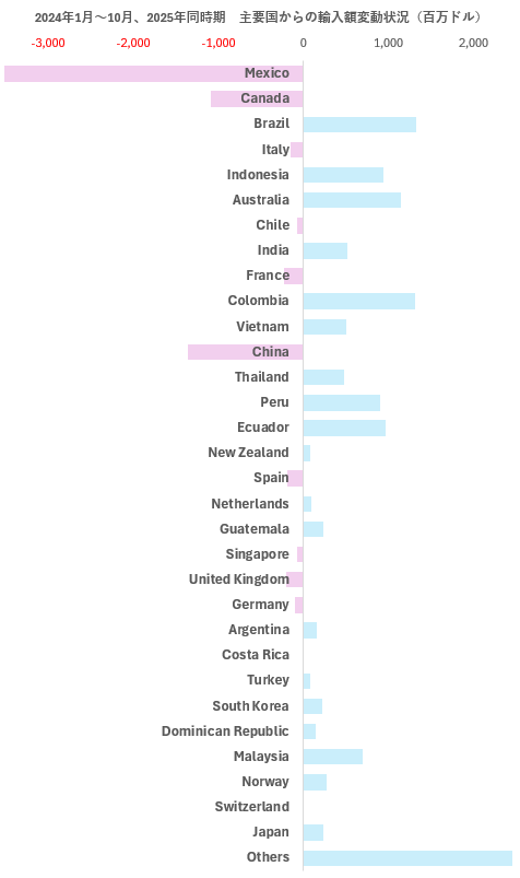 2025年1月~10月累計入額と2024年同時期額との差では、総計では57億ドル増加している。国別では、メキシコからが35億ドル減(8.5%減)、カナダが11億ドル減(2.9%減)、中国からが14億ドル減(23.4%減)の一方、ブラジルからが13億ドル増(216%増)、オーストラリアからが11億ドル増(26.2%増)、コロンビアからが13億ドル増(36.6%増)、また、マレーシアからは7億ドル増と額では小さいが、増加率では75.3%と一番増加している。