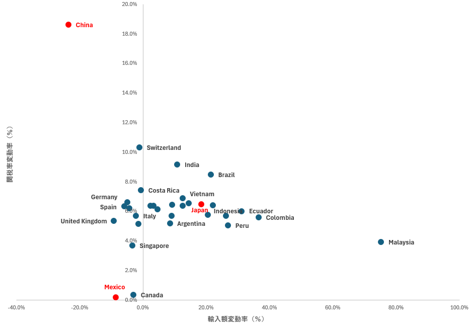 2025年1月~10月累計と2024年同時期の変動を、横軸に輸入額変動率、縦軸に関税率変動率で散布図としてみると、中国は特筆して、関税率の大幅な増加により、輸入額が減少している。その一方で、スイスは関税率が大幅に増加している割には、輸入額の変動はほぼない状況。メキシコ、カナダは関税率変動はほとんどないが、輸入額が減少している状況。マレーシアは、関税率変動と比較して、輸入額変動が大きく伸びている。輸入額返送率と関税率変動率の相関係数はマイナス0.24で、関税率が増加すれば輸入額が減少の傾向がみてとれるが、係数としては小さく、一概に関連があるとはいえない
