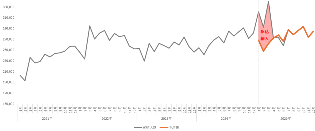 アメリカの2021年1月~2025年7月の実輸入額(百万ドル)と2025年1月~12月の予測輸入額(百万ドル)