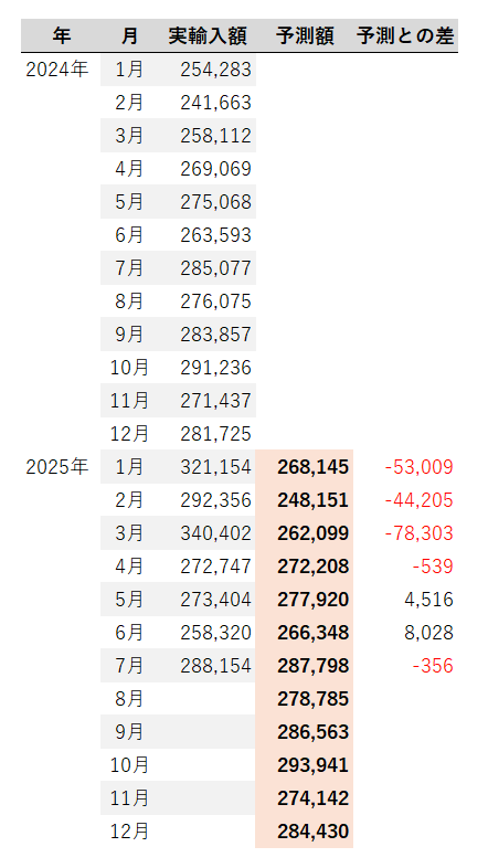 輸入額は季節性があり、1月、2月は例年輸入額が落ちるために、予測額も低く予測しているが、1月~3月の実輸入額は予測額より大幅に高い額となっており、一種の異常値(駆け込み輸入)と言えるのではと思われる。7月の予測額は、実輸入額に近い値となっているので、8月以降の予測値と実輸入額の差異をみていきたい(コードや結果データは、別記事として改めて掲載予定)。