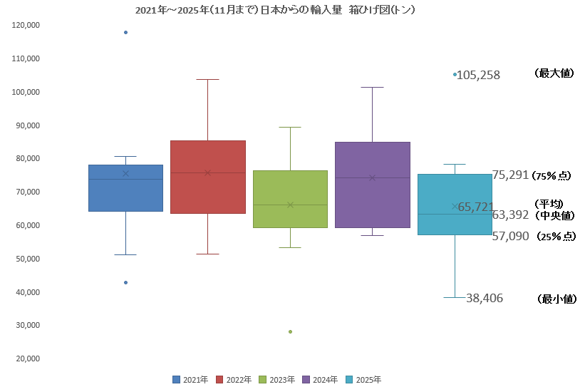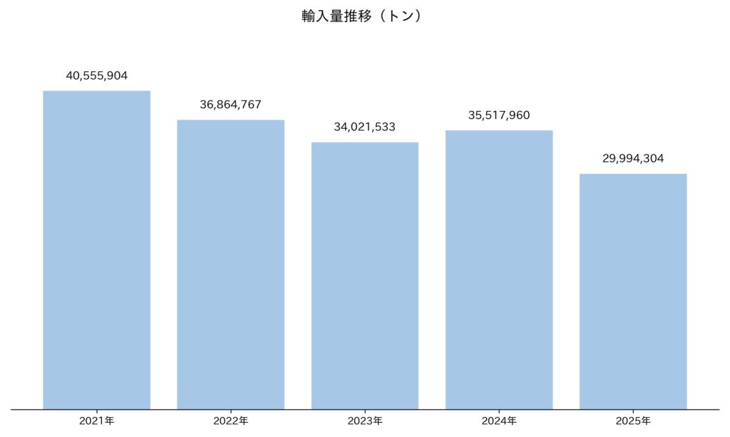 - 2025年(11月まで)は平均輸入量は、2024年平均と比較して7.9%減少