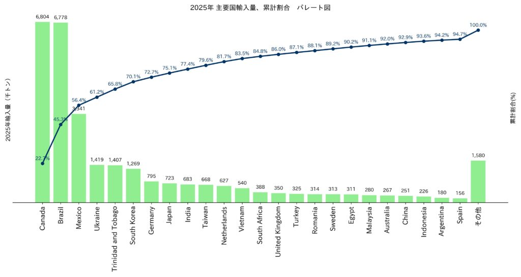 2025年1月~11月小計輸入量(2,999万トン)を国別パレート図でみると、上位3ケ国以降は、少量輸入の国が多く24ケ国で95%に達する