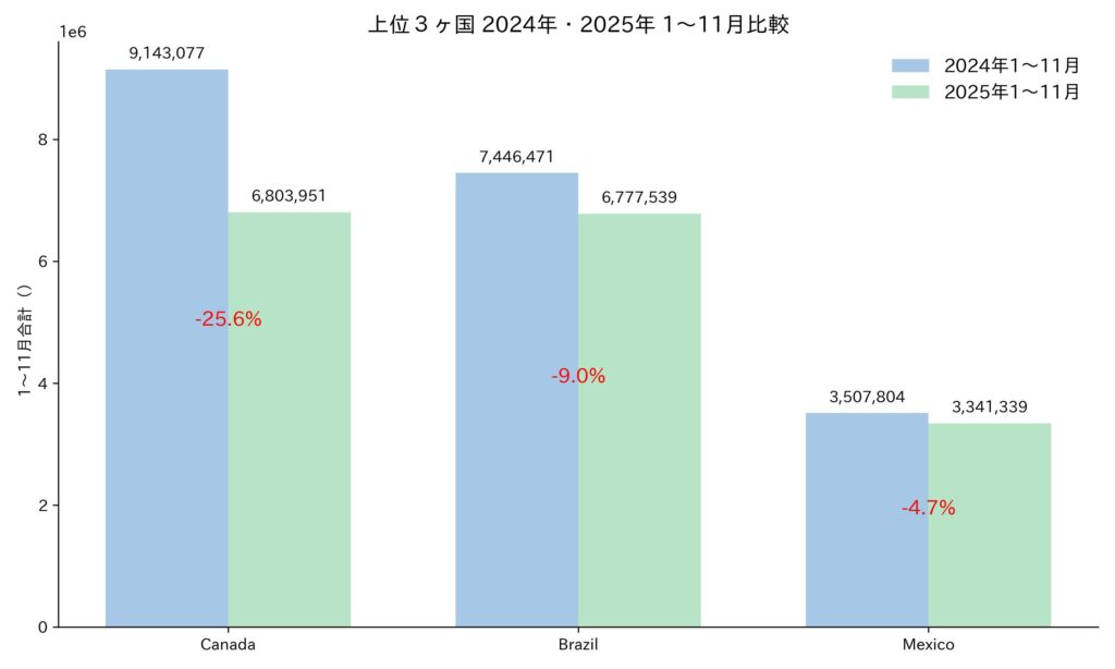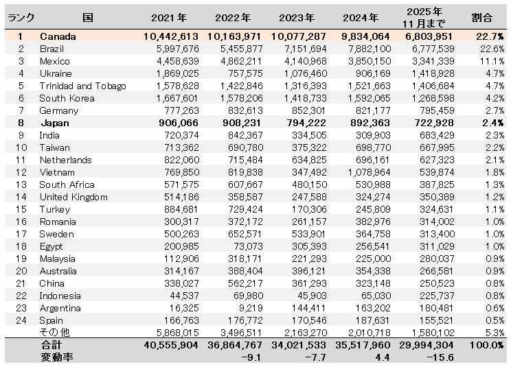 - カナダからの輸入は2024年同時期比で25.6%の大幅減少