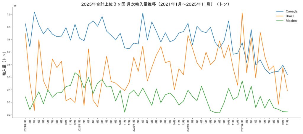 上位3ケ国の2021年1月~2025年11月までの、月次輸入量推移をみると、