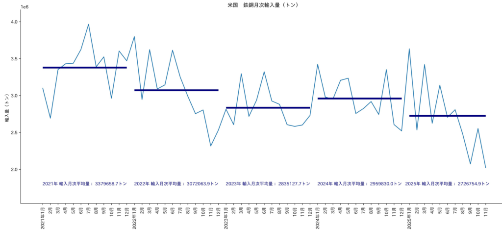 - アメリカの2025年11月までの鉄鋼(HSコード:72)の輸入総量は2,999万トン