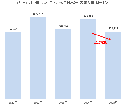 - 2025年1月~11月小計輸入量は72.3万トンで、2024年同時期の82.1万トンから12.0%の大幅減少