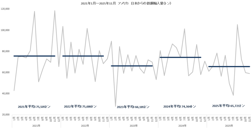 アメリカの日本からの鉄鋼輸入量でみると(2021年~2025年 1月~11月小計)、