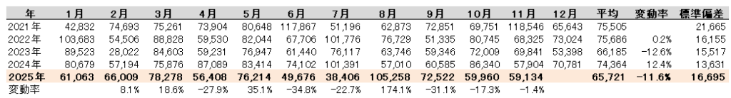- 2021年~2025年 1月~11月小計における月次の輸入量推移をみると、乱高下が激しい