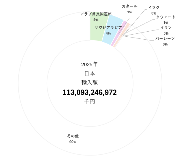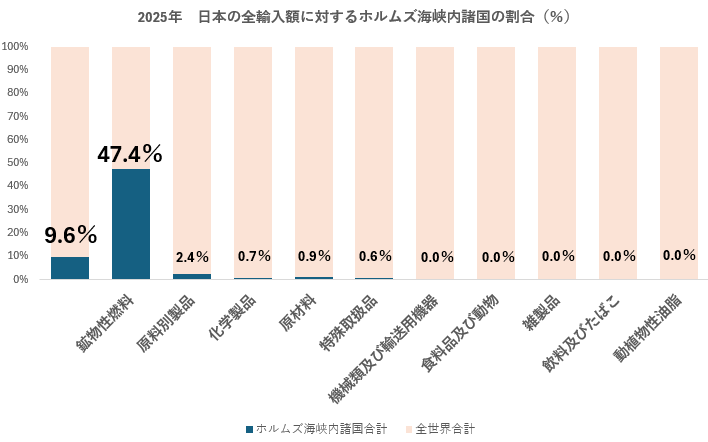 - 2025年における日本のイランを含めたホルムズ海峡内7ケ国からの輸入総額は10兆9,025億円で、全輸入額(113兆932億円)の9.6%