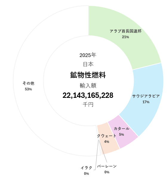 鉱物性燃料全輸入額(22兆1,432億円)の各国別割りをみると