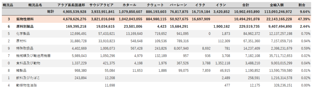 2025年 日本のホルムズ海峡内諸国からの輸入額詳細(概況品別)(千円)
