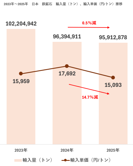 - 2025年における日本の鉄鉱石(概況品:21501)輸入量は9,591万トン