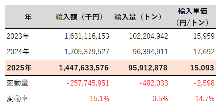 - 単純に輸入額を輸入量で割った2025年における日本の輸入単価は15,093円/トン