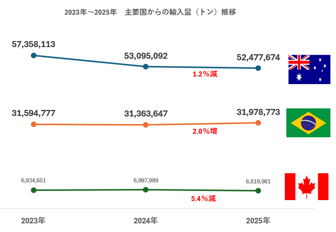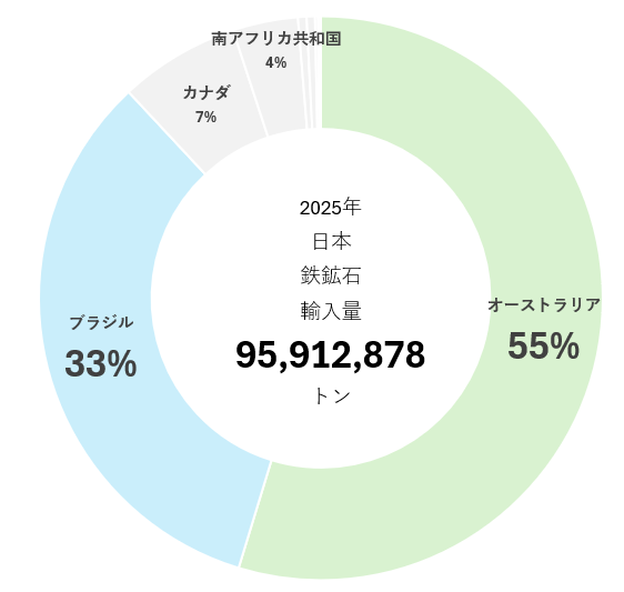2025年における日本の鉄鉱石輸入量(9,591万トン)の主要国からの輸入量推移をみると、