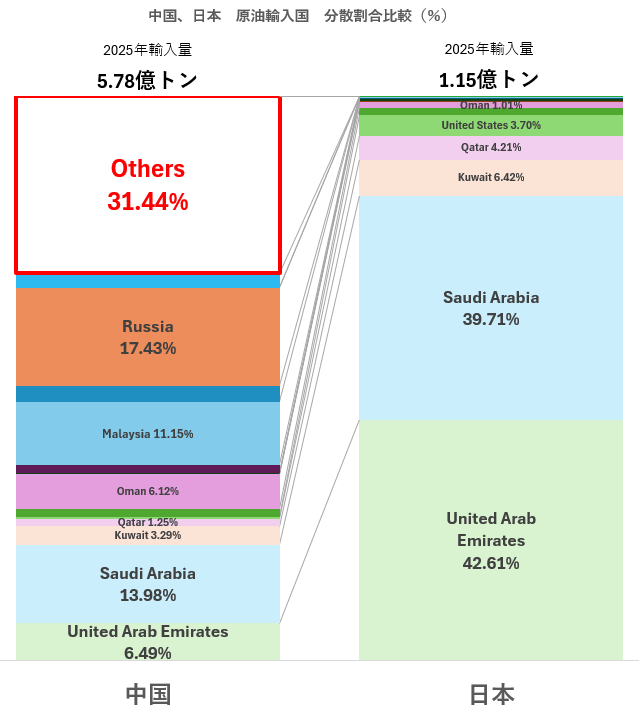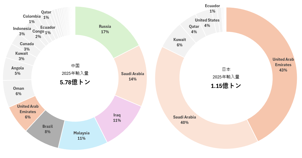 2025年 中国(左)、日本(右) 原油輸入量比較(国別)(億トン)
