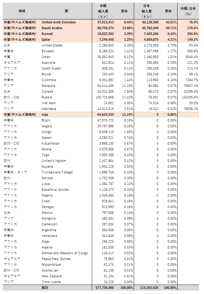 *ホルムズ海峡内国は、アラブ首長国連邦、サウジアラビア、クウェート、カタール、イラク。中東はオマーンのみとした。