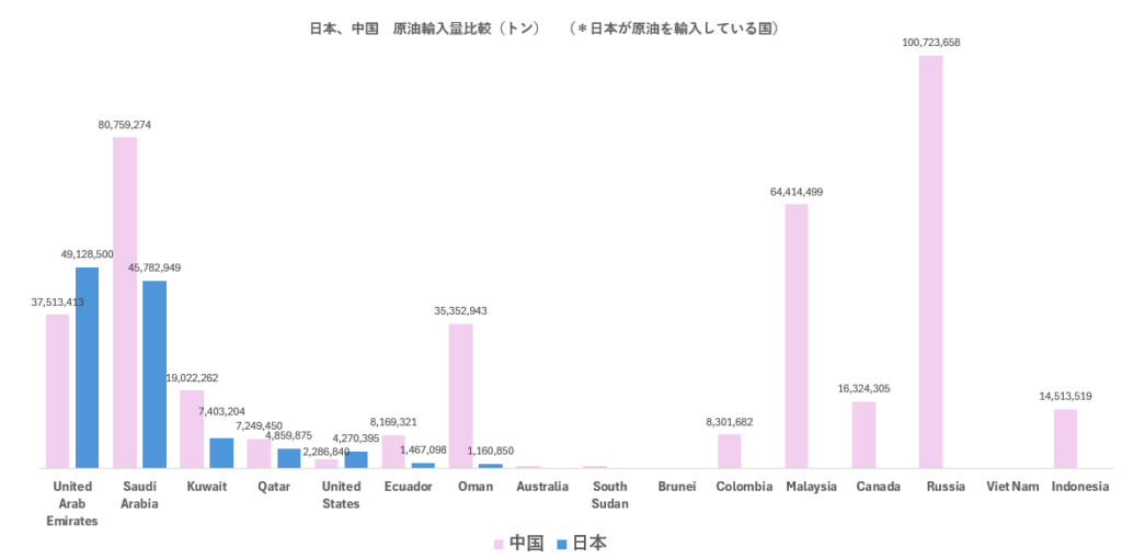 2025年 中国、日本 原油輸入量(トン)国別