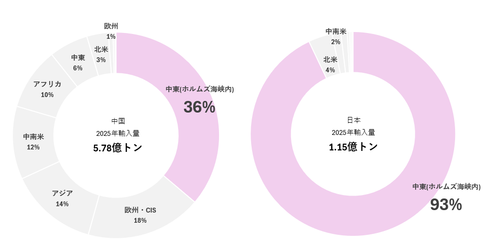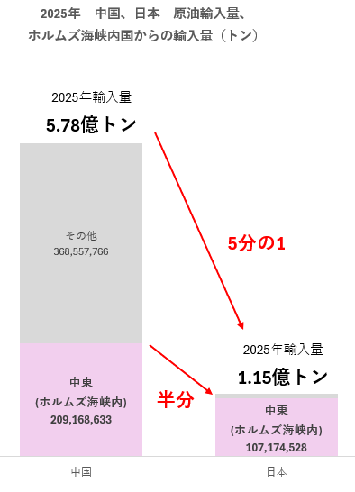 - 2025年に中国は、ホルムズ海峡内国から2.09億トン輸入