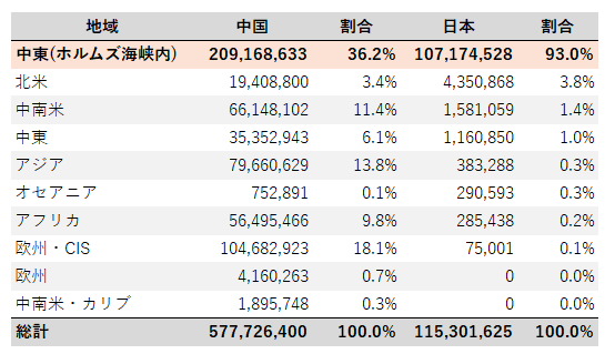 2025年 中国、日本 原油輸入量(トン)地域別