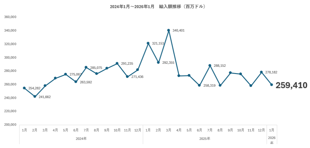 2024年1月~2026年1月 アメリカの輸入額推移(百万ドル)