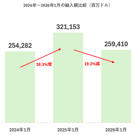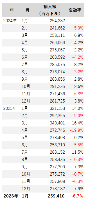 • 2026年1月のアメリカの輸入額は2,594億ドル