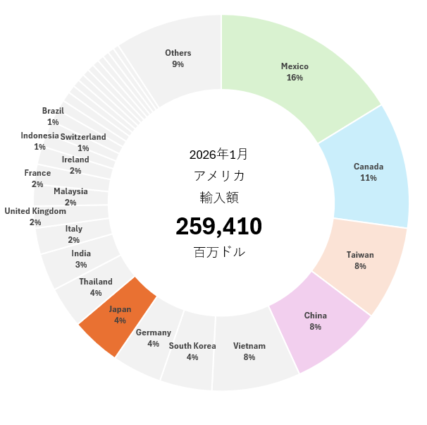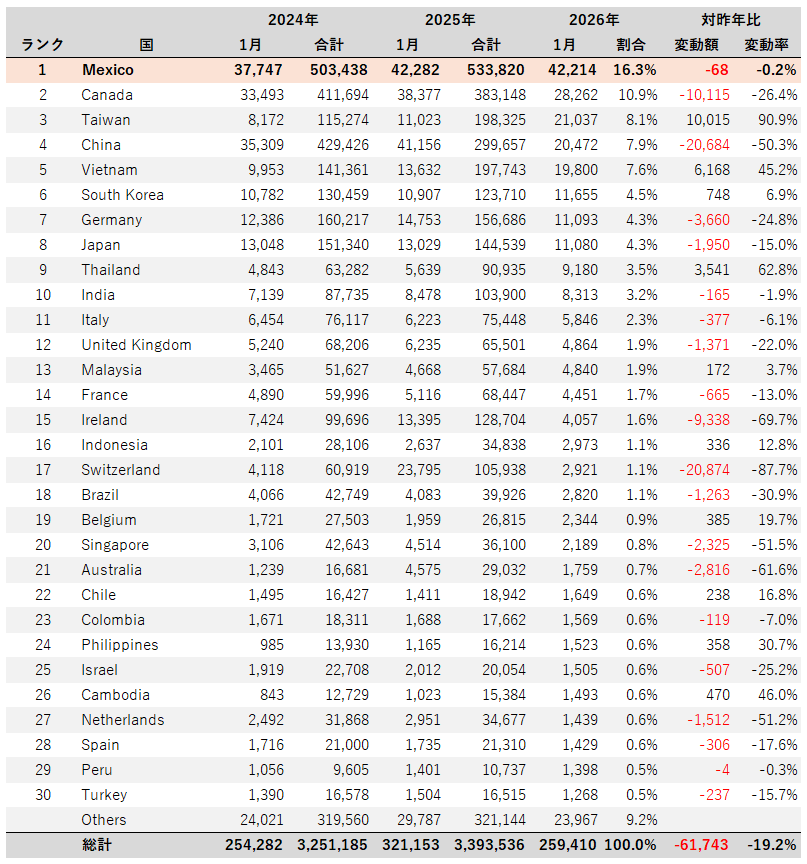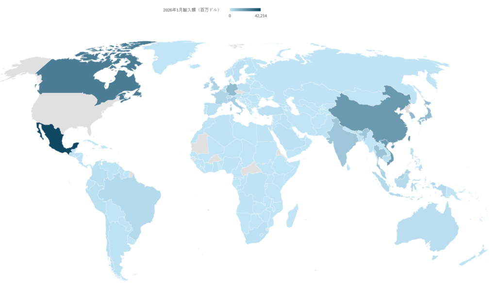 • 2026年1月の輸入額(2,594億ドル)のうち、メキシコからの輸入額が422億ドル(16%)でトップ