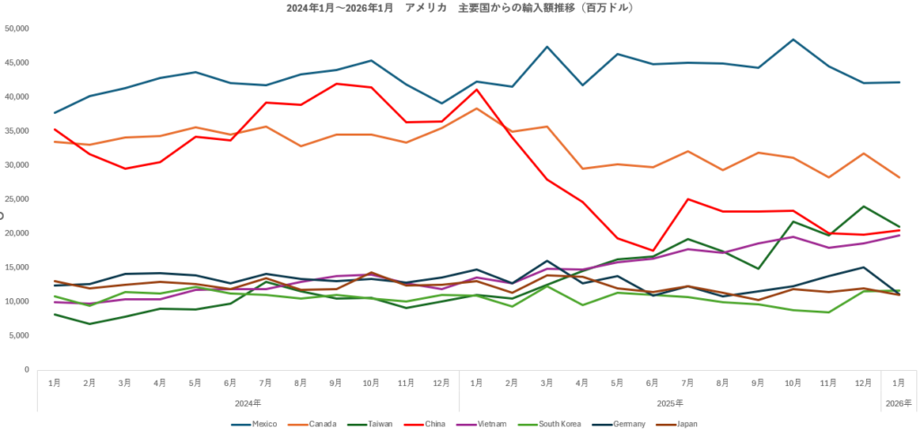 2024年~2026年1月 アメリカの主要国からの輸入額推移(百万ドル)
