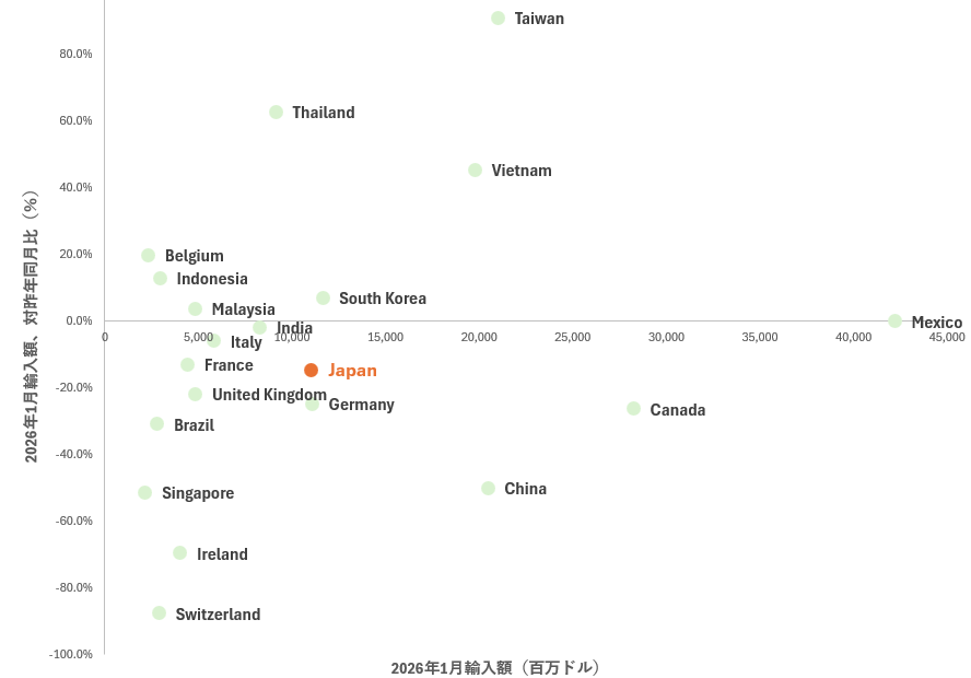 横軸に2026年1月輸入額(百万ドル)、縦軸に2026年1月輸入額、対昨年同月比(%)をとった散布図でみると、