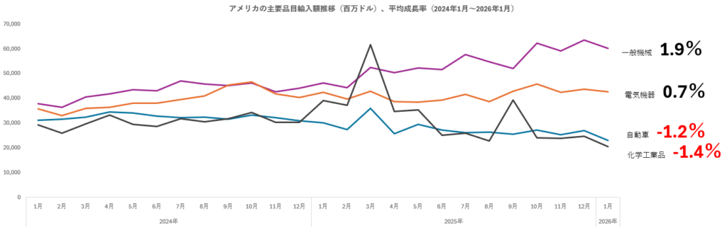 2024年~2026年1月 アメリカ輸入額推移(百万ドル)(品目別)